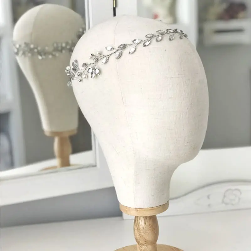 Corona enredadera delicada tejida a mano con cristales y perlas que acompañan el peinado con sutileza y movimiento.