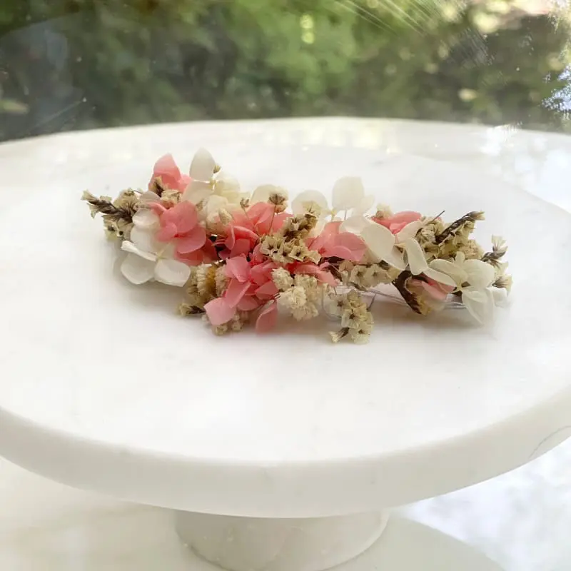 Tocado media corona en tonos blancos con rosados de flores preservadas confeccionado a mano.