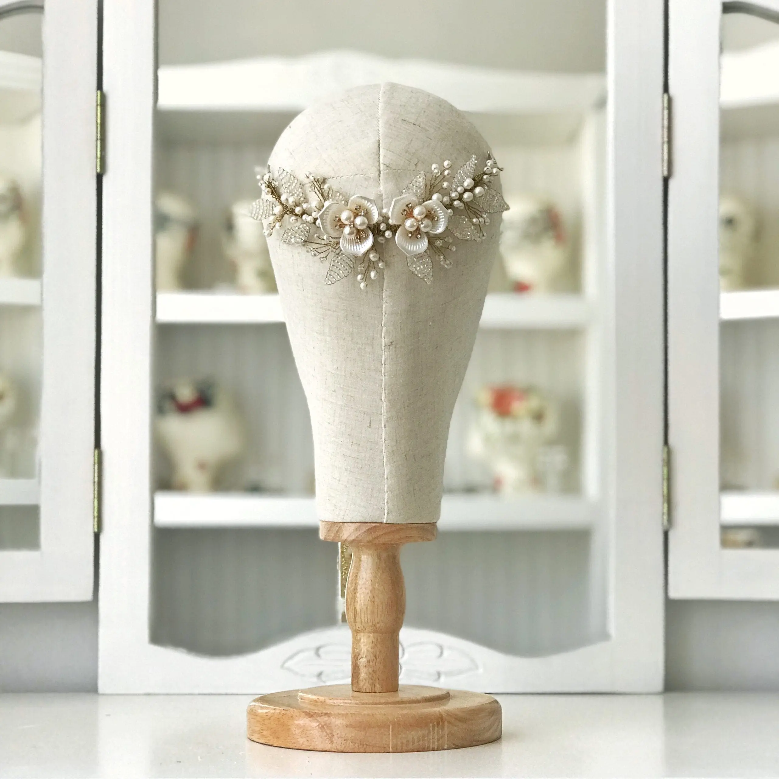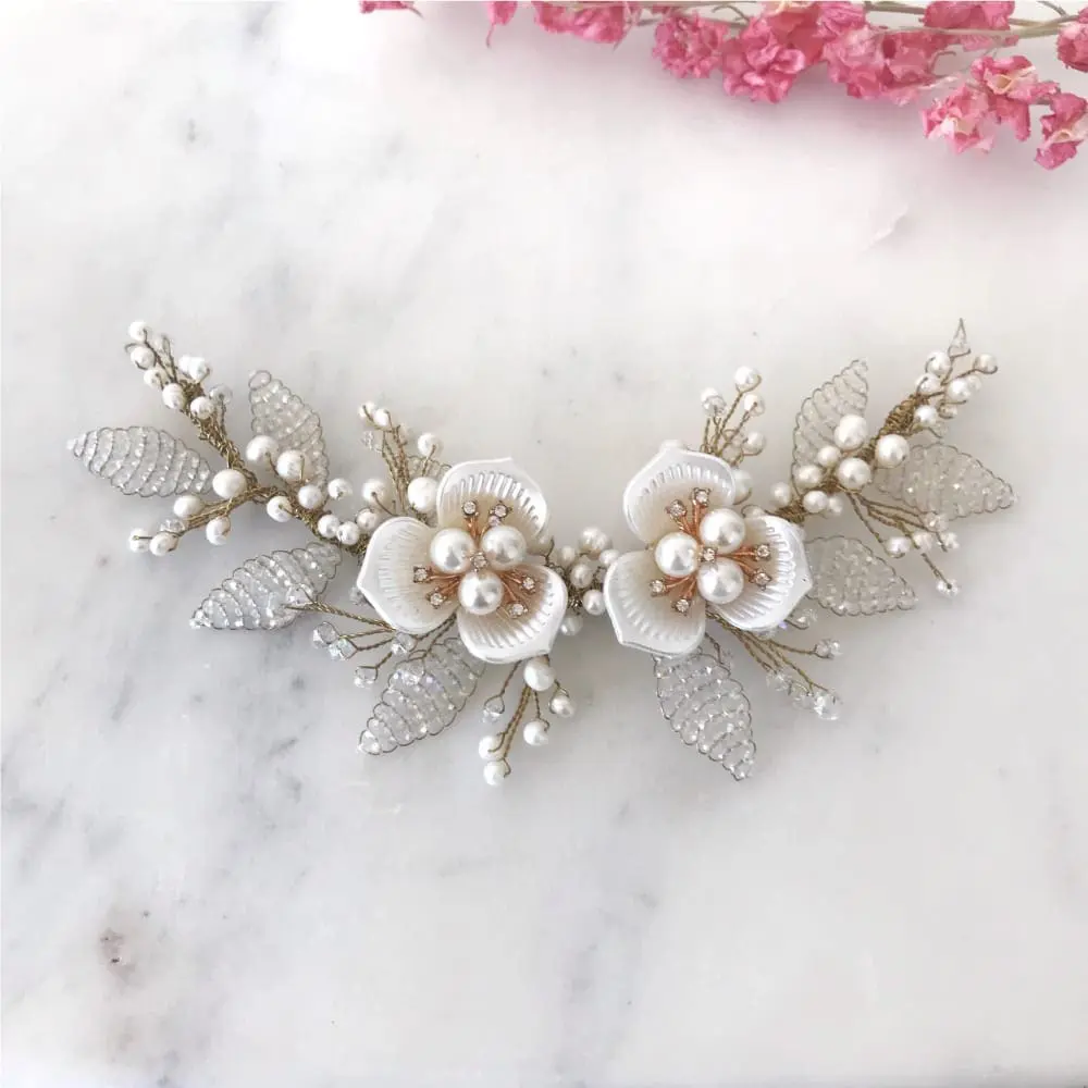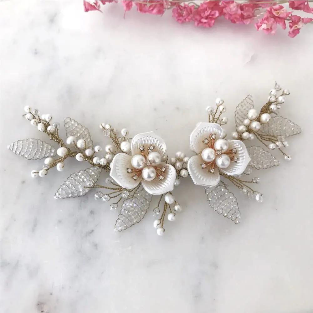 Tocado media corona de flores medium, con aplicaciones de perlas de río y hojas confeccionadas a mano con cristales. Posee una longitud de 19 cm y un ancho máximo de 6 cm.