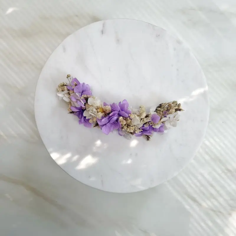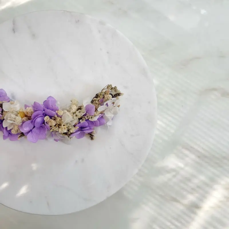 Tocado media corona en tonos blancos con morados de flores preservadas confeccionado a mano.